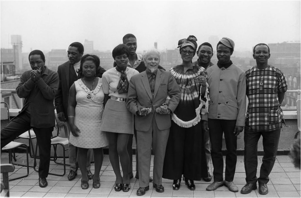 Photograph: Bloke Modisane and the cast of his radio play “The Quarter Million Boys”, with producer Charles Lefeaux in London 1969