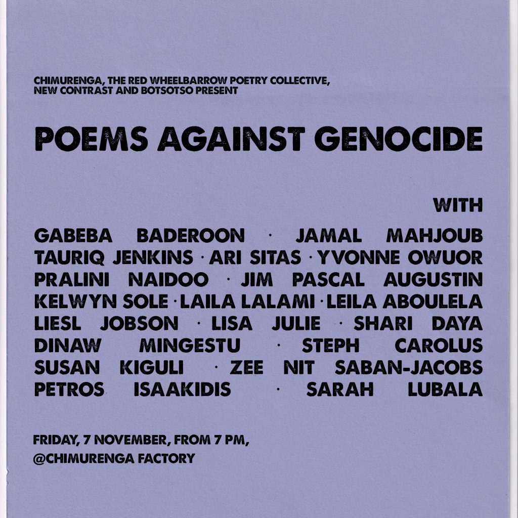 Chimurenga, The Red Wheelbarrow Poetry Collective, New Contrast and Botsotso are honoured to present ‘Poems Against Genocide’, an evening of poetic performance bringing together beloved and venerated voices in solidarity with the struggle against war in Palestine