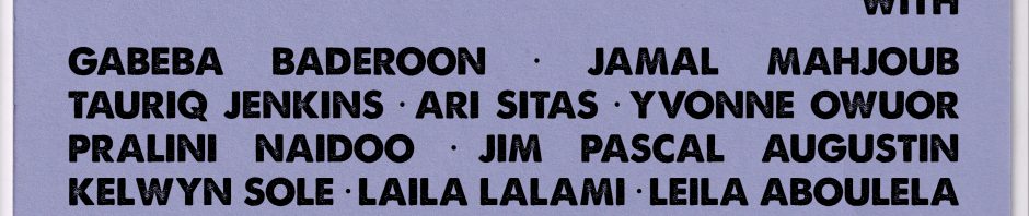 The evening’s contributors will include; Gabeba Baderoon, Jamal Mahjoub, Tauriq Jenkins, Ari Sitas, Yvonne Owuor, Pralini Naidoo, Jim Pascal Augustin, Kelwyn Sole, Laila Lalami, Leila Aboulela, Liesl Jobson, Lisa Julie, Shari Daya, Dinaw Mingestu, Steph Carolus, Susan Kiguli, Zeenit Saban-Jacobs, Petros Isaakidis & Sarah Lubala.